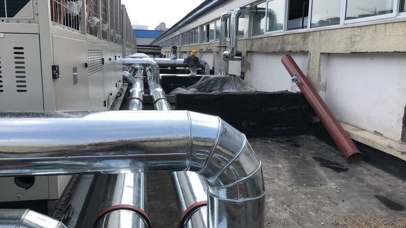 空調(diào)模塊機(jī)組管道防腐保溫工程施工流程為里層包裹橡塑保溫材料,然后外層就是我們看到的鐵皮管道保溫。